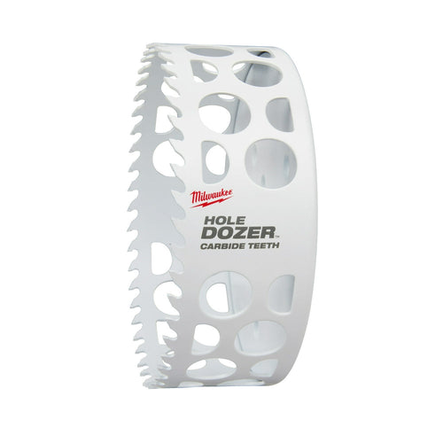 The MILWAUKEE® 5" HOLE DOZER™ with Carbide Teeth Hole Saw features a new 3 TPI design that offers fast cuts with the durability of a bi-metal hole saw and life of a carbide hole saw. This Milwaukee hole saw provides the longest life in general purpose and extreme materials with the ability to cut through stainless steel, cast iron, fastener embedded wood, cement board, fiberglass, plaster, asphalt shingles, and more with ease. Deep gullets clear material fast while cutting, and Milwaukee's ALL-ACCESS SLOTS solve the frustration of plug removal for more productivity with less downtime between holes. The new slot design also provides increased pilot visibility for accurate placement and faster chip ejection keeping cuts cool. The HOLE DOZER™ with Carbide Teeth Hole Saw has a cutting depth of 1.62 in., allowing clearance to handle cuts in a wide range of materials. Milwaukee HOLE DOZER™ with Carbide Teeth Hole Saws are proudly made in the USA.